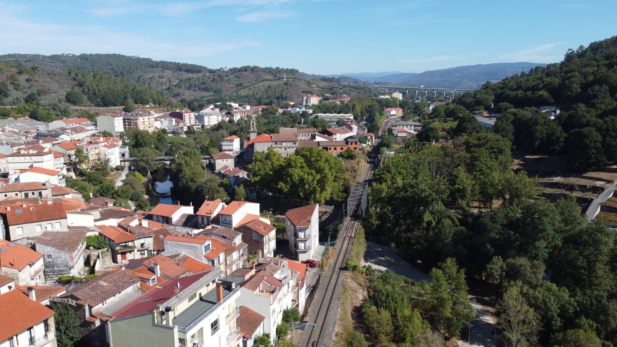 Vista de sur a Norte coa ponte de Ferro do Ferrocarril e o río Avia.