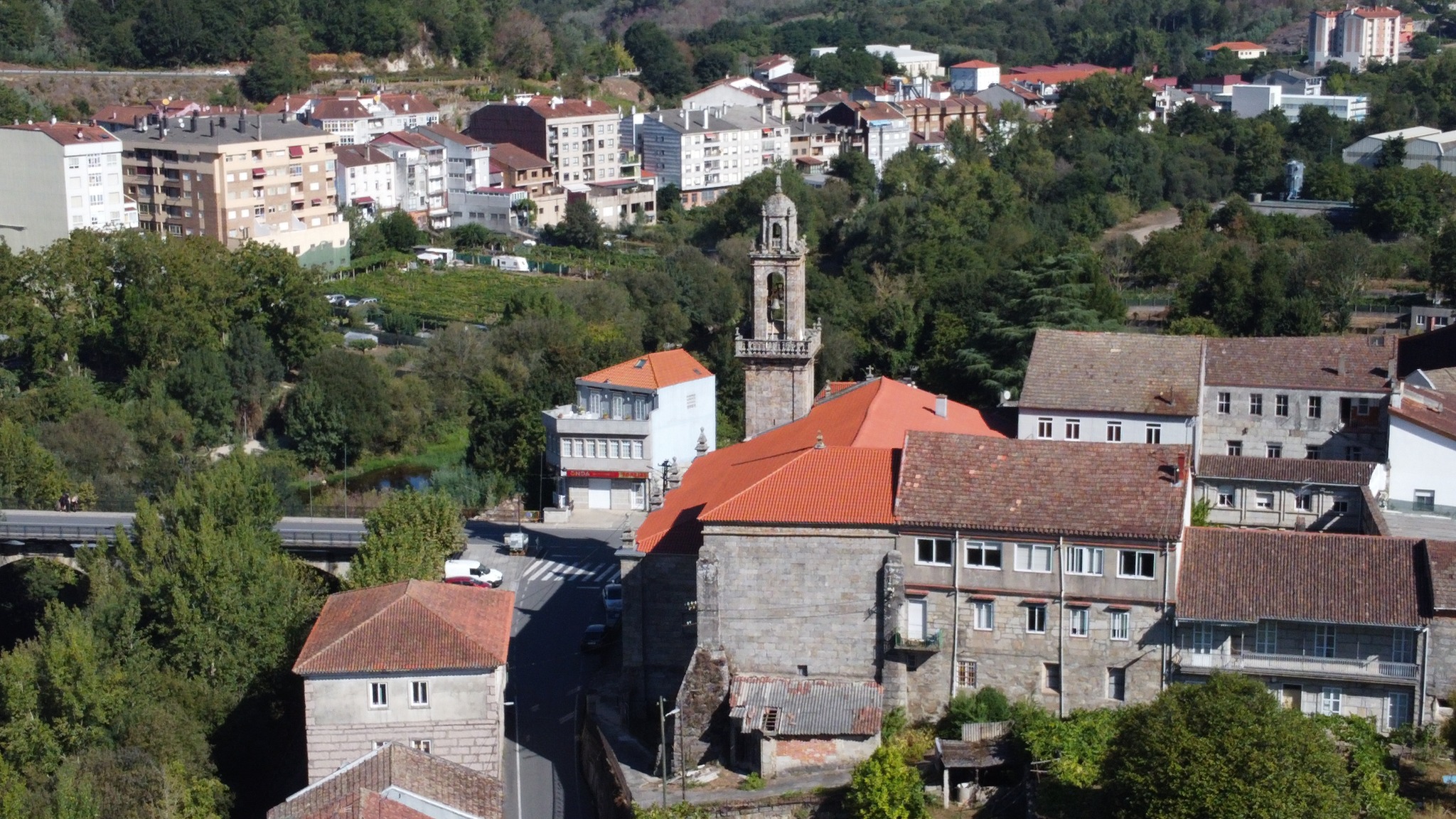 A esquerda o río Avia, a Ponte sobre o Avia da N-120-e a igrexa de San Francisco,