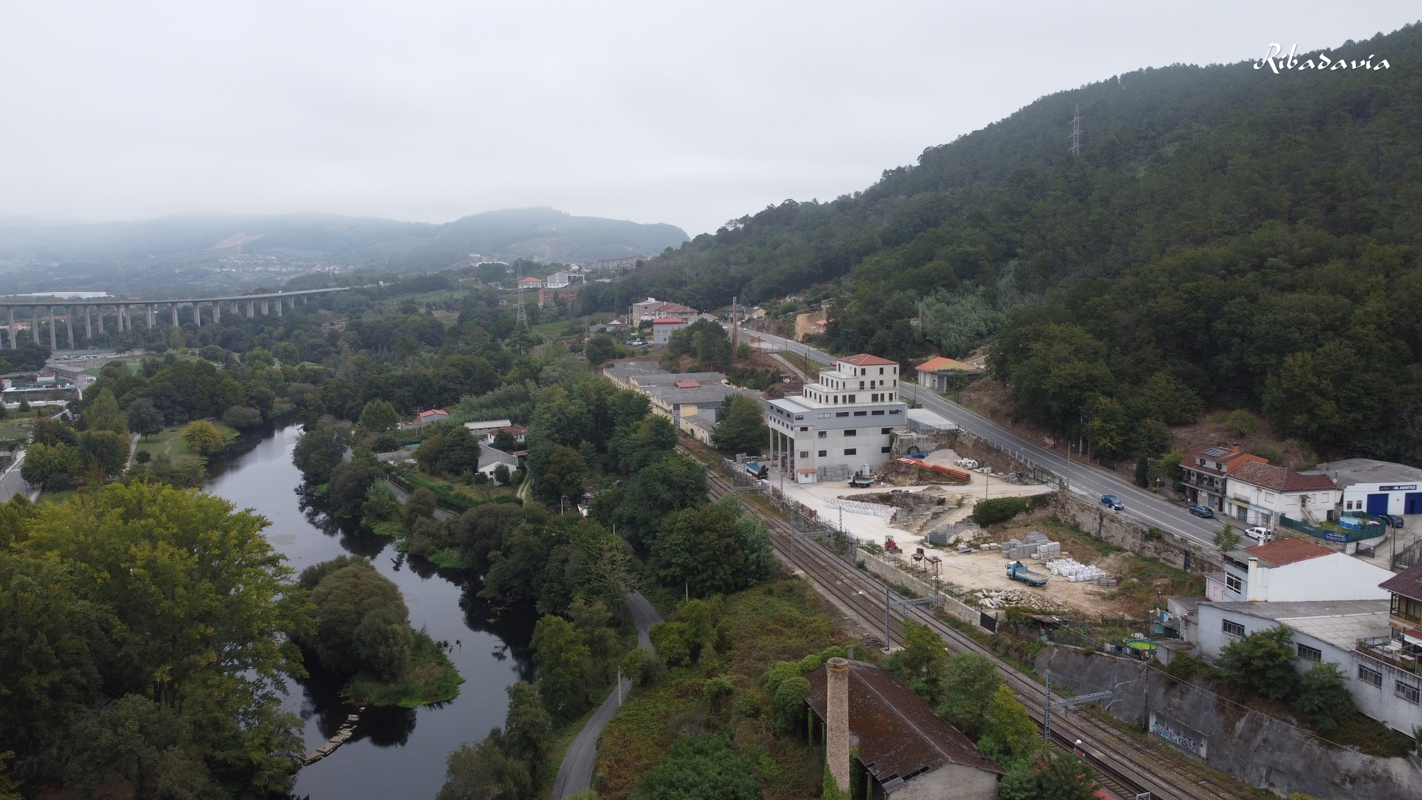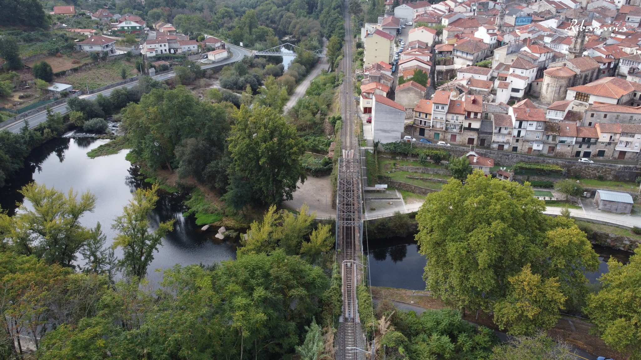 incorporación, no fondo, o camiño que vai a carón do río. A vía do tren e