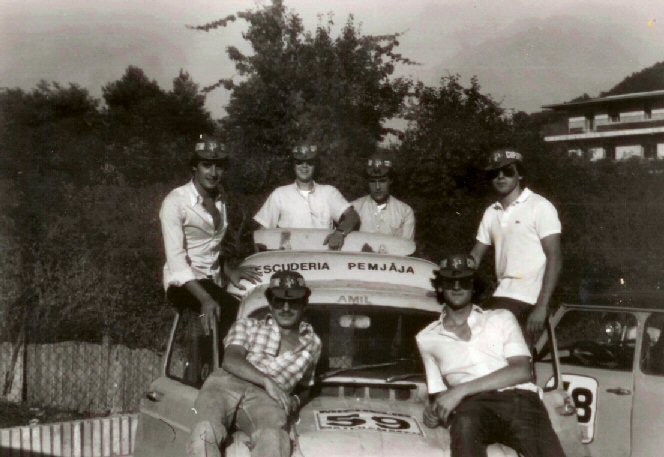 Escudería Pemjama. Detrás José "Gallo", Julio Freijido, Manuel, Enrique Pumar. Delante Alberto, Cuchi y Paco (hermano de Galo). Coche Renault de reparto de Pepe Casas que era el piloto y el fotógrafo.