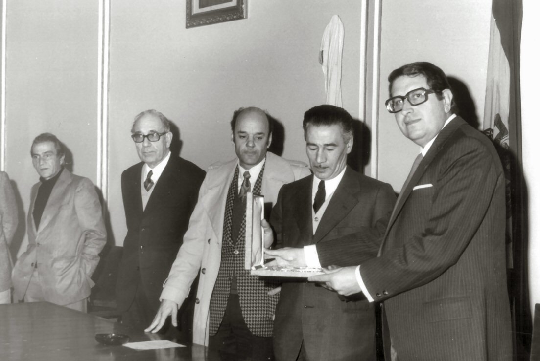 1974. Entrega de una placa al padre de Miriam. En la fotografía entre otros el alcalde de Ribadavia y Braulio que pertenecia a aquella coroporación.