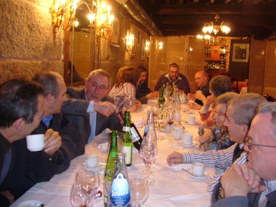 Vista general de los asistentes a la comida. En la fotografía la mayoría son compañeros y amigos de aquellas épocas. Aunque Alfonso el primero a la izquierda fue alumno.Por cierto Conchita Cachafeiro, la tercera de la derecha, aparte de amiga y compañera fue conmigo de copiloto los nueve años a Ribadavia, desde Ourense. Casi nada...