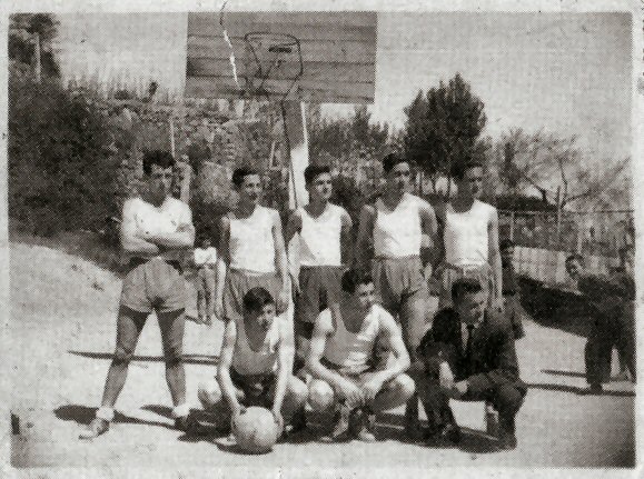 Equipo de Baloncesto de Ribadavia 195?: Raúl Modroño, Nesto Soto, Hermida Alonso, Benito Amil, Santiago Martínez, José Luís Garcia, Pepe Escudero e Javier meruendano. Exemplar escaneado por Benito Amil sacado do libro Álbúms para o Reencontro Ribadavia e os Ribadavienses III.