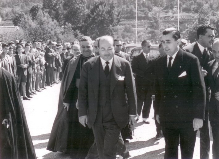 Inauguración do instituto Laboral de Ribadavia onde está actualmente o instituto O Ribeiro. Na fotografía aparte de Monseñor Temiño e do Ministro Rubio está o alcalde de Ribadavia naquel intre D. Joaquín Robla. Ano 1958. Sin dúbida un momento único e importantísimo para Ribadavia.