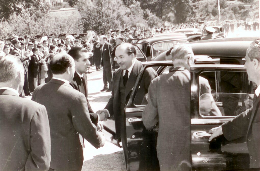 LLegada del Ministro. Lo recibe el alcalde de Ribadavia D. Joaquín Robla.