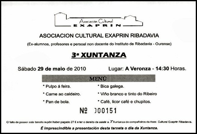 3ª xuntanza - EXAPRIN. Lugar: A Veronza. Ribadavia Día : 29 de maio 2009 Hora: 14:30 Precio comida: 27 € .