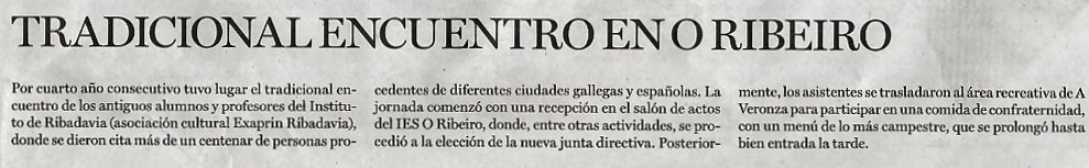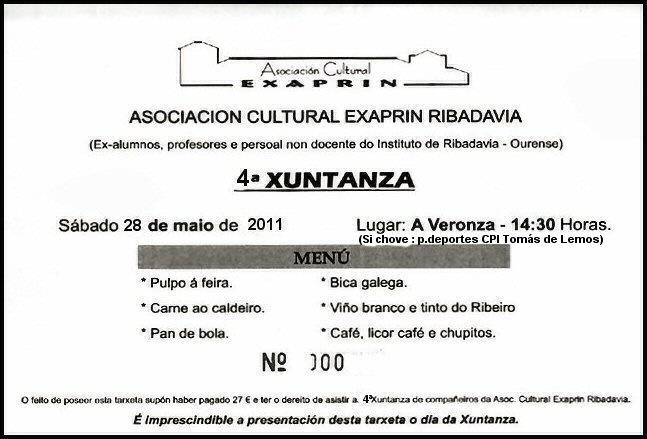 3ª xuntanza - EXAPRIN. Lugar: A Veronza. Ribadavia Día : 28 de maio 2011 Hora: 14:30 Precio comida: 27 € .