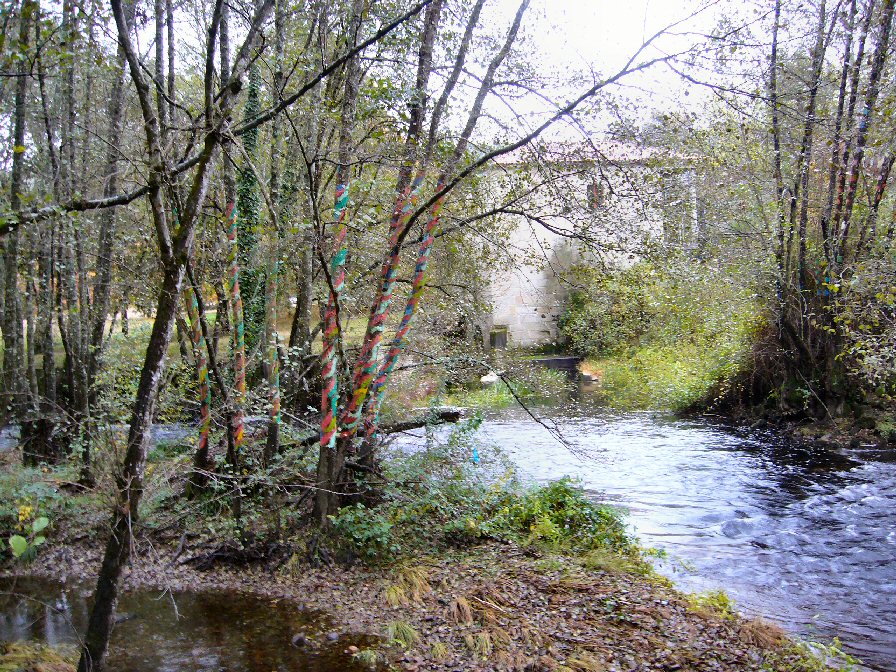 Saída da minicentral no Rexo. Árbores pintados por Ibarrola.