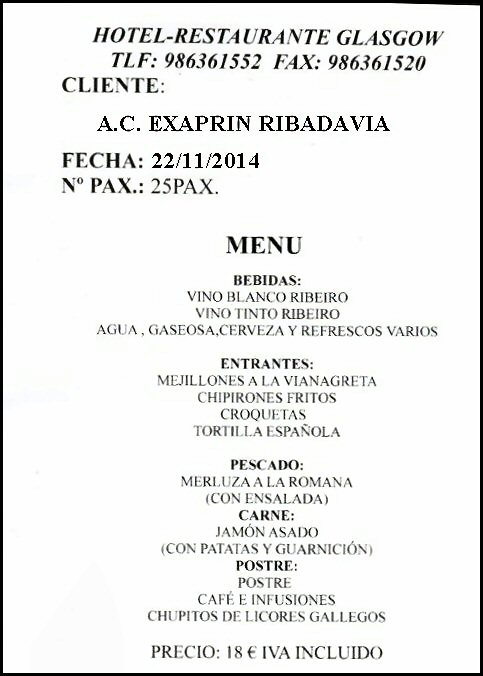 Si queres disfrutar dun día marabilloso, nun lugar único de Galicia: tes que ingresar o importe de 32 euros na conta que Exaprin ten en ABANCA en Ribadavia, indicando no ingreso o nome da persoa ou persoas que van asistir. A conta é o número